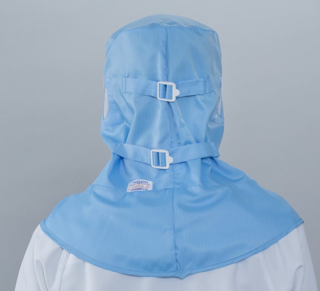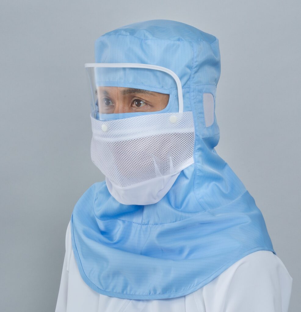低発塵性、制電性、耐久性に優れた、高密度ツイル組織の防塵衣用素材でできたグラスシールド付きフードです。