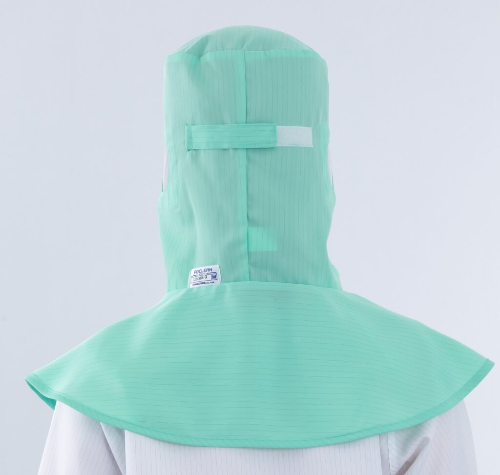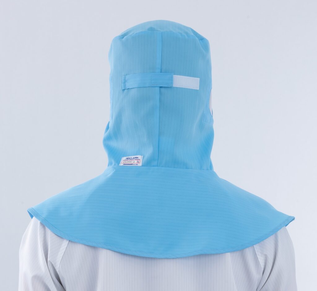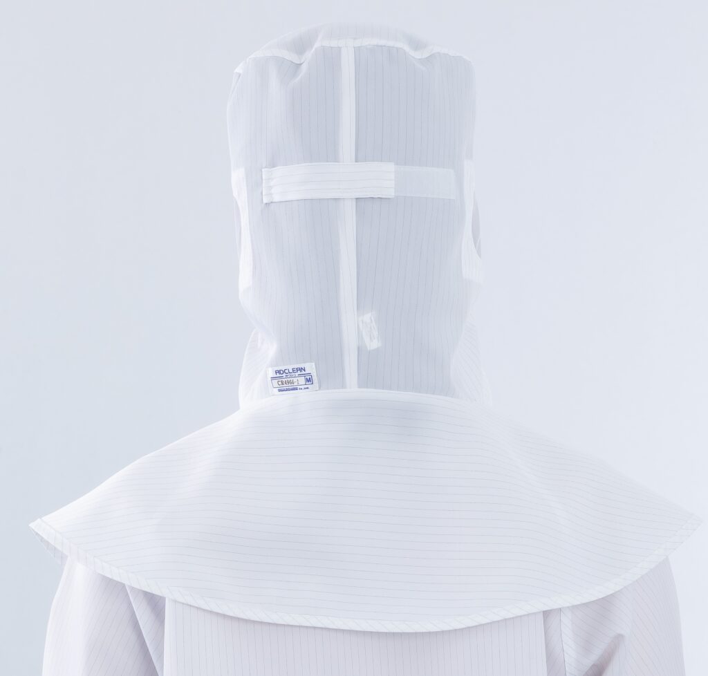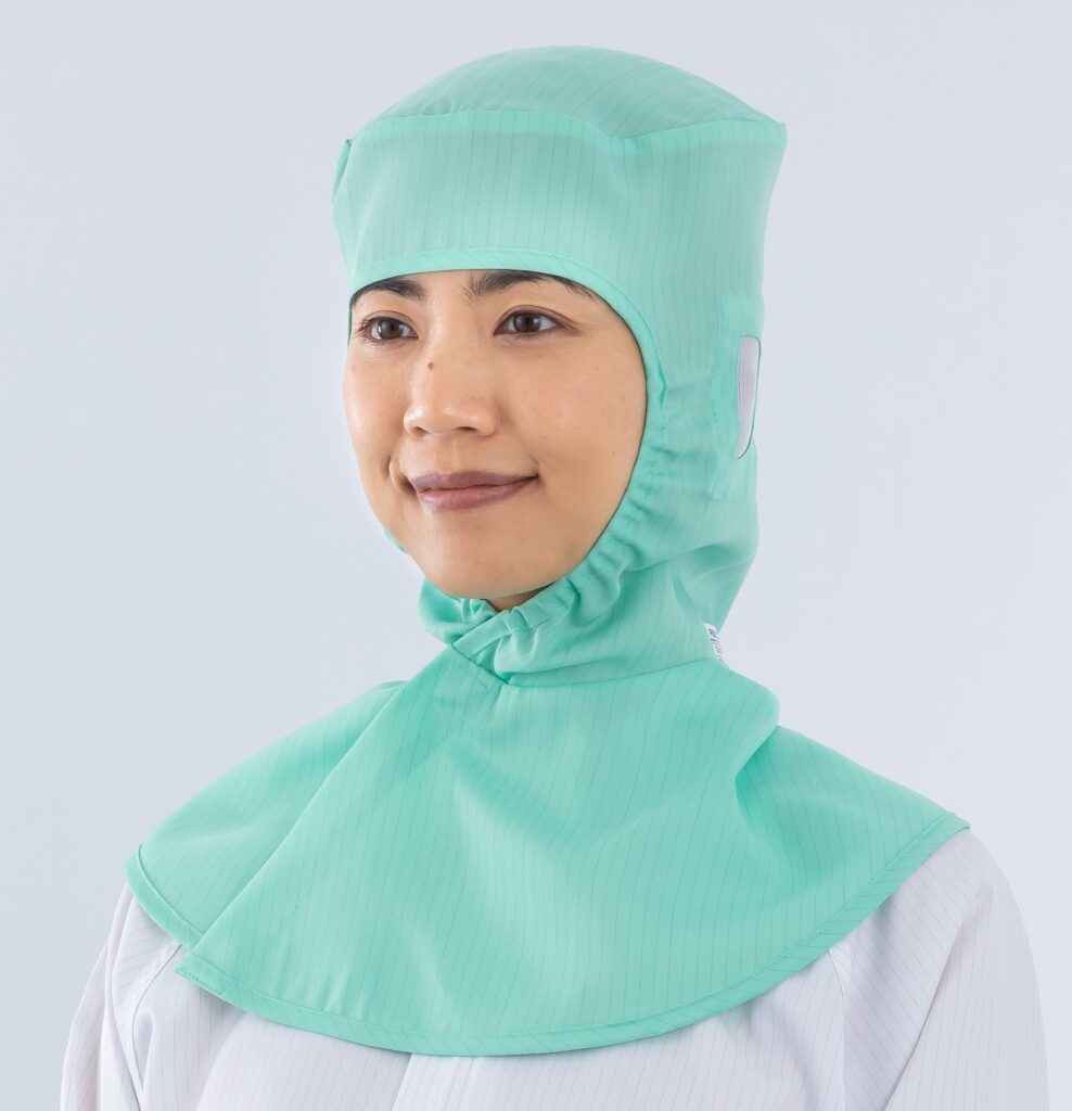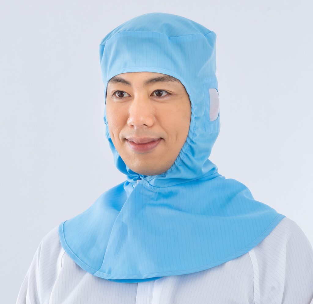低発塵性と高い通気性(60cc)によりムレ感の軽減を両立した清涼クリーンツバ無しフード